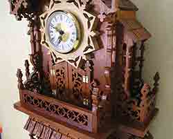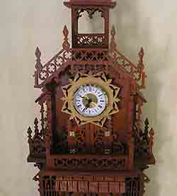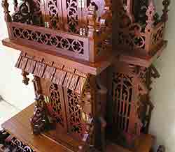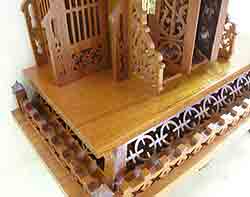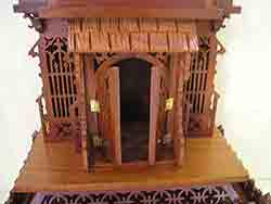 38 1/2" high. 17 3/4" wide. Constructed from red cedar and white beech. Doors open. Hand carved shingle roof. |